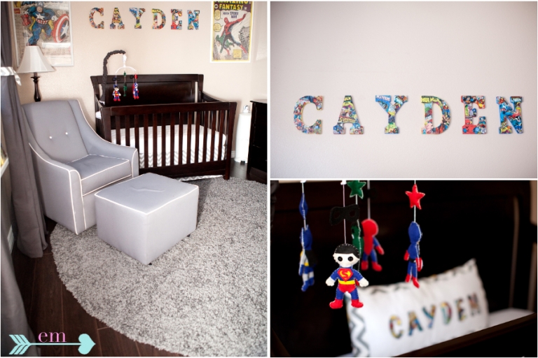 Cayden’s nursery was designed and crafted by Charles, Amber Jo and her family. They thought of every superhero detail. She even hand-sticked the rad mobile.