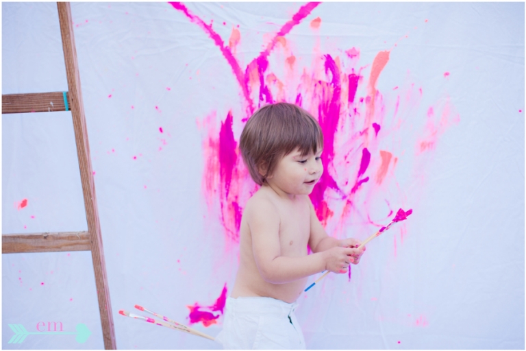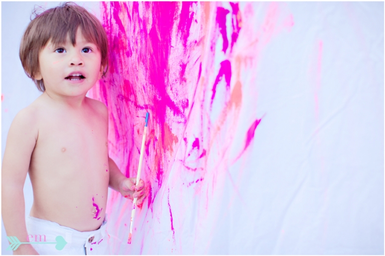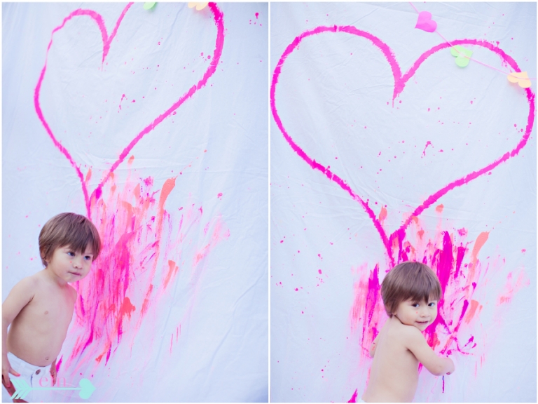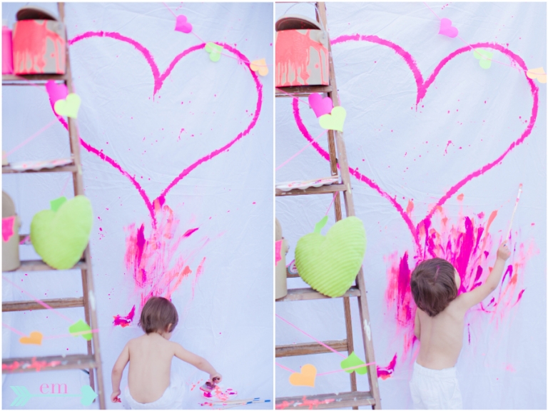 Need I say anymore? No. Last year I had both outdoor and indoor mini photo sessions for my son’s first Valentine’s Day. For the outside photos I used red balloons and red hearts. When I photographed the inside session, there was so much light-pink that I thought I was inside of a cotton candy machine. This time I wanted to go bold and bright. I wanted to add a little more creativity so I thought, what would be cuter then a little half naked painter trying to create a picture for his mama? Well, nothing is better-duh! So yes the torturous mama that I am had my little guy flex his muscles and show off his rather talented painting strokes in the brisk cold of a February afternoon. I promise that when he gets older and asks me why I snapped these silly photos of him every Valentine’s day, I will tell him because I LOVED HIM so much that I couldn’t think of a better Valentine’s Day gift to receive than a charming photo of my son.
